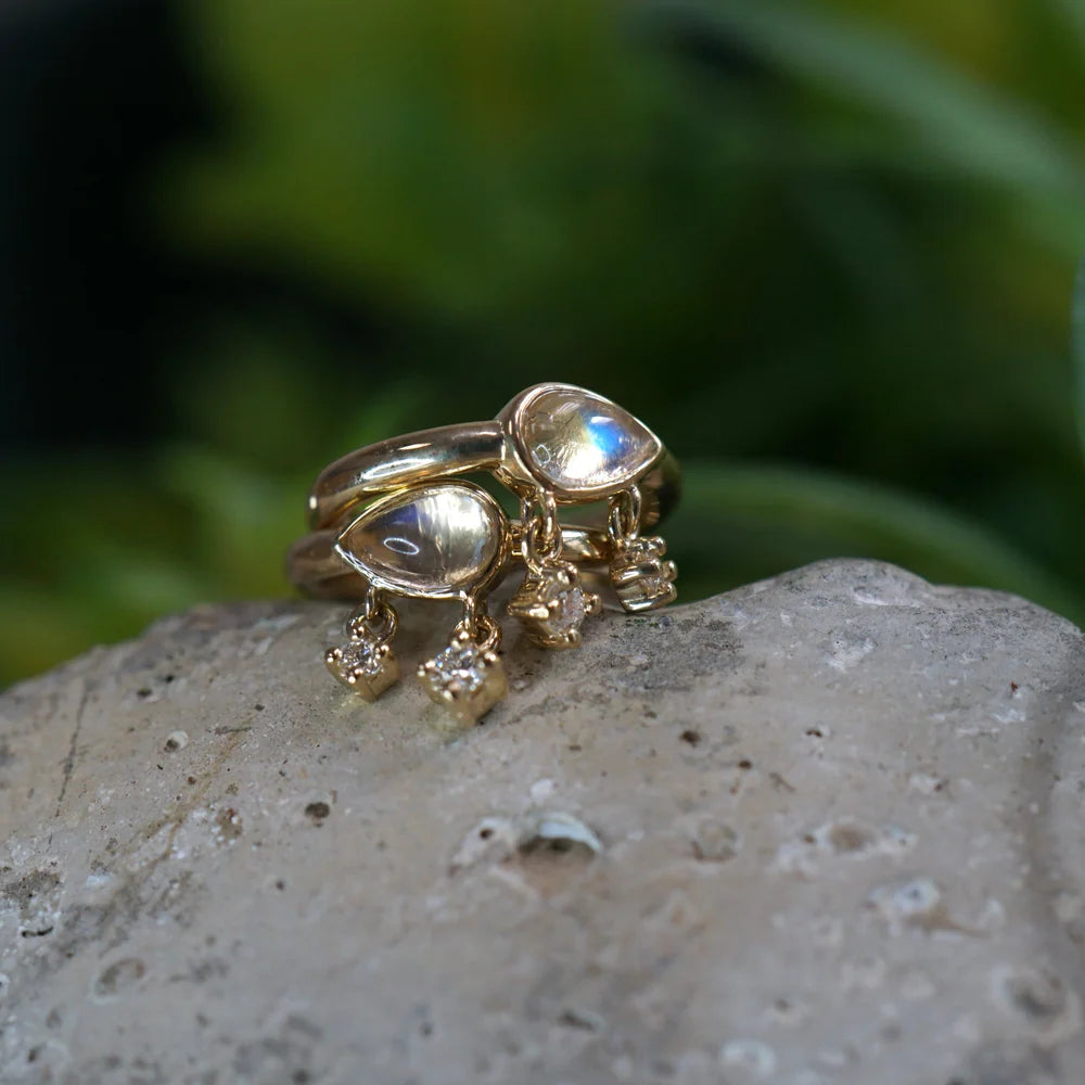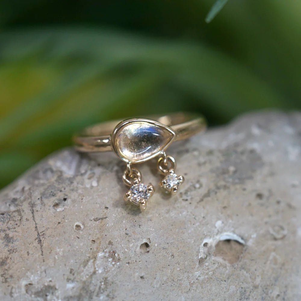 Hinged clicker hoop with East-West set pear cabochon gemstone and 2 diamond dangles.