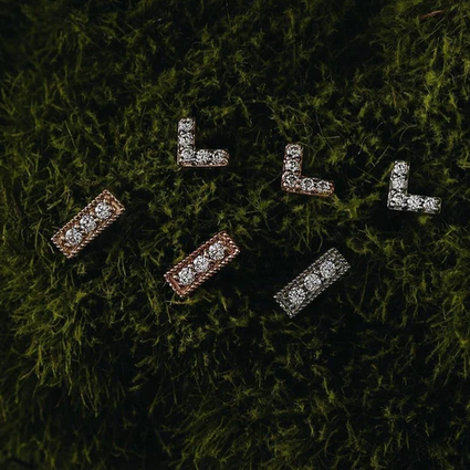 The Chevron with Cubic Zirconia piece features 5 gemstones with 1mm diameter lined in a bold, geometric chevron shape. This contemporary threadless decorative end is available in 14 karat Yellow Gold, White Gold and Rose Gold.