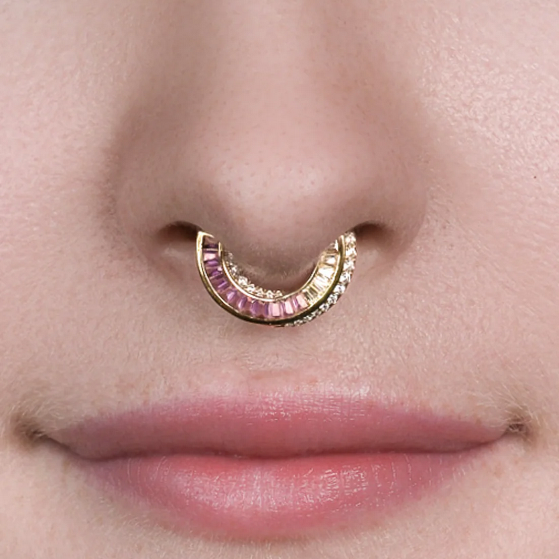 Echelon in Amethyst channels bold elegance through clean lines and rich color. A seamless ombré of tapered baguette-cut amethysts and CZs creates a radiant gradient that catches the light with every movement. Designed for effortless styling, it’s perfect for clients who want structured sparkle with a vibrant twist.