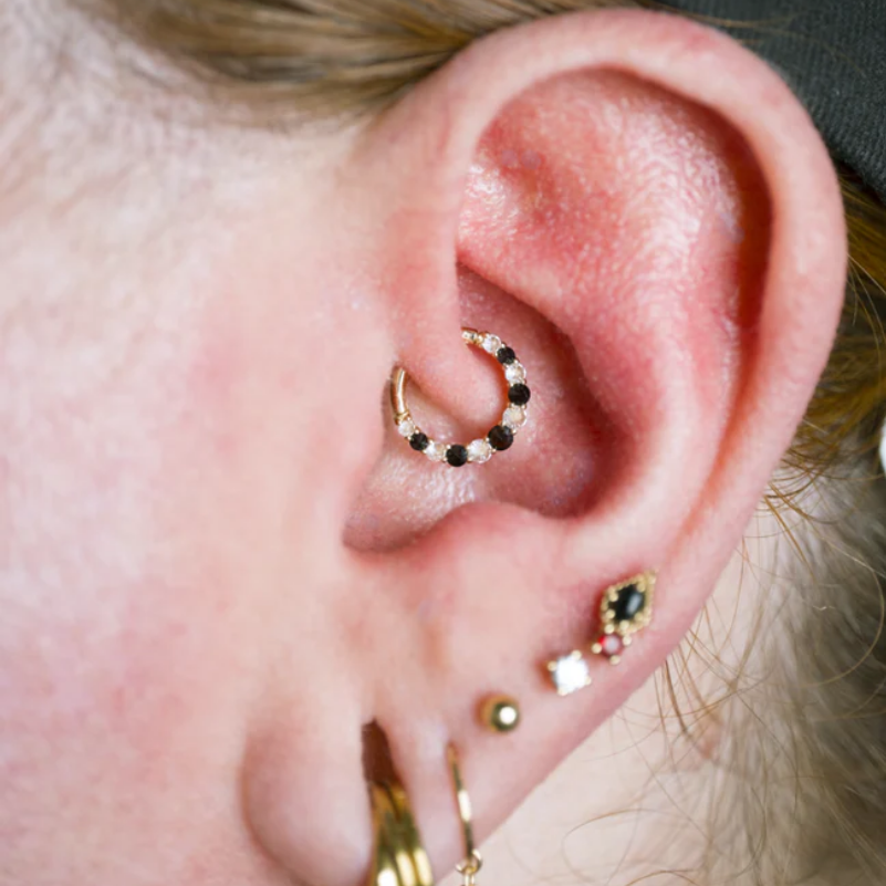 The Eclipse Clicker combines the brilliance of CZ with the boldness of black spinel, creating a stunning contrast that's perfect for any ear stack. This piece captures the allure of an eclipse, offering a touch of celestial elegance. Elevate your look with this eye-catching clicker, designed to shine day or night.