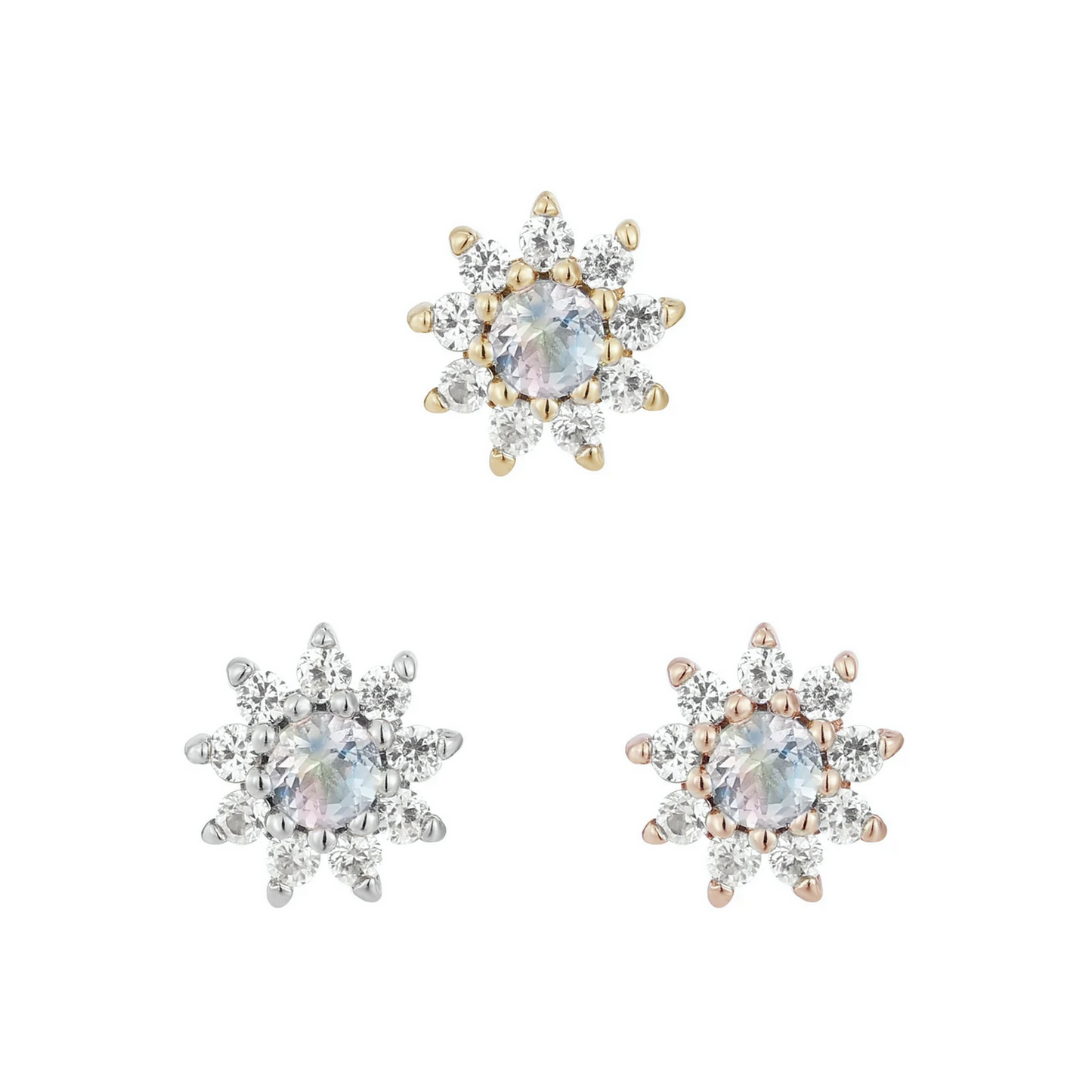 - Gemstone: (1) 2mm Rainbow Moonstone and (9) 1mm White Sapphires