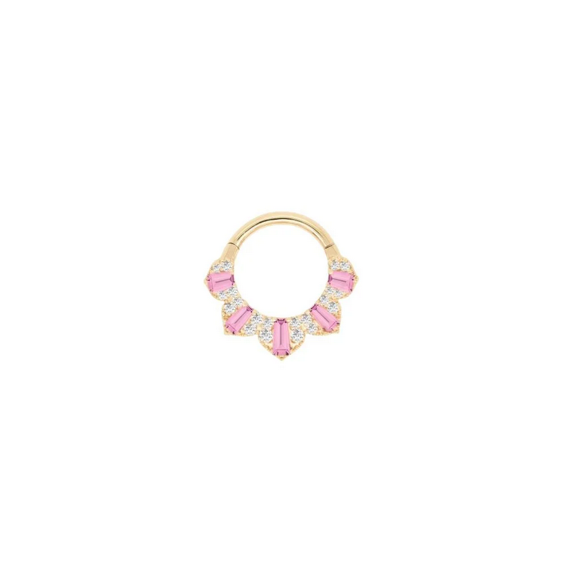 Soft yet striking, Gilty Pleasure in Pink Tourmaline brings a vibrant, colorful touch to any stack. This bold pink stone is accented with natural white diamonds for elevated sparkle that plays beautifully in daiths, septums, or high-impact conch placements. Available in 5/16" and 3/8" sizes, with a seamless clicker mechanism for easy, secure wear. A go-to choice for colorful, romantic curations.