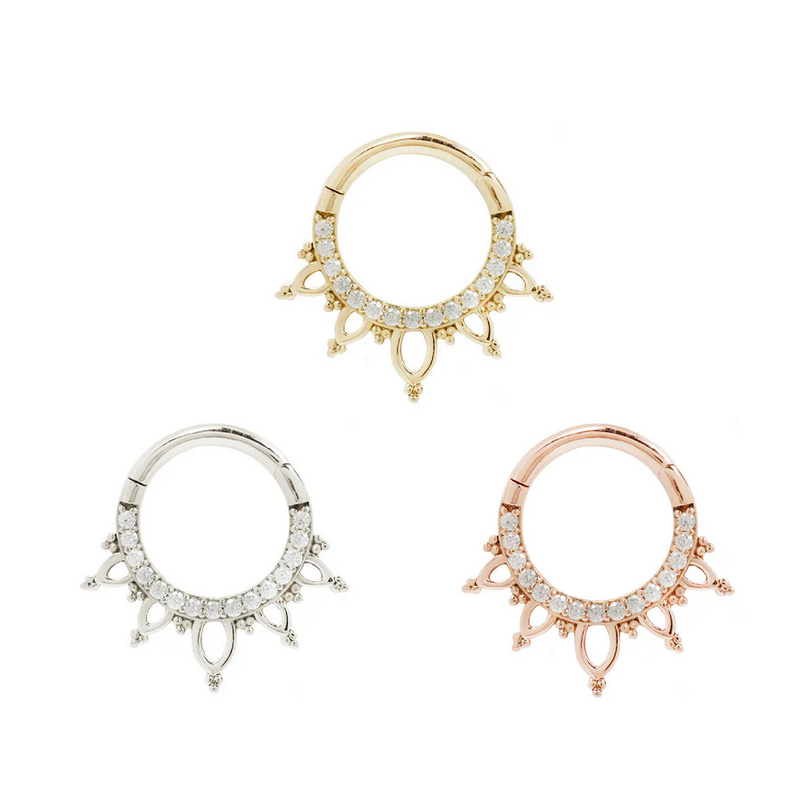This design features a lovely row of fifteen round cut CZ's and stunning, handcrafted beading. With a hinged clasp that allows you to easily open and close it's perfect to wear in your septum, earlobe, daith piercing and much more!