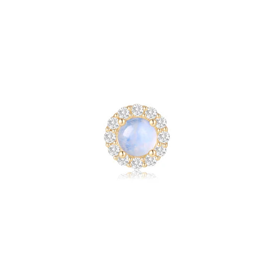 A shimmering Moissanite halo and a glowing Blue Moonstone cabochon, all in a perfect petite profile. One look and you will get why we call it Joy!