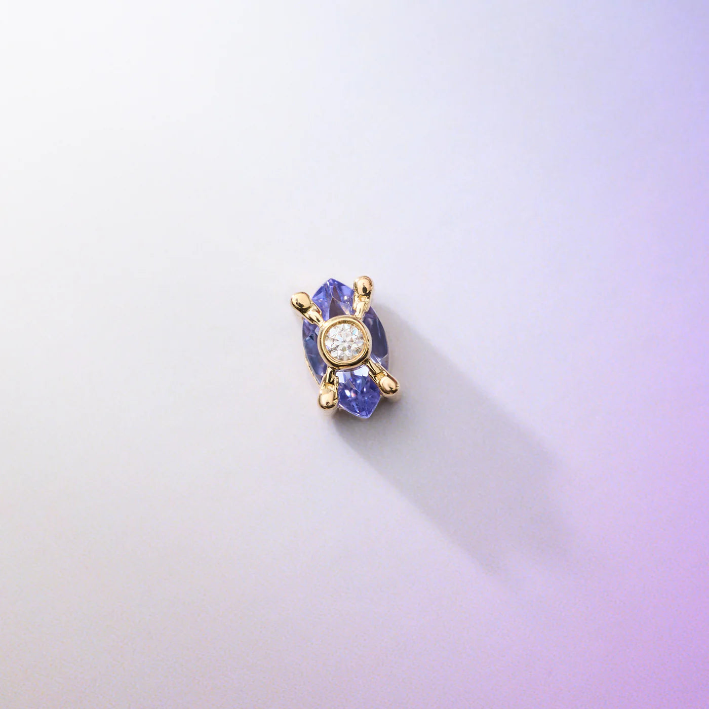 Shine secured. Four prongs and delicate chains lock in a glowing marquise-cut tanzanite, set beneath a bezel-set moissanite that beams from the center.