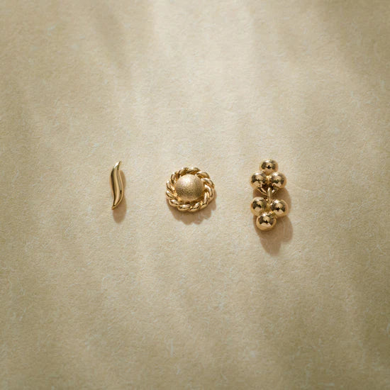 A tiny explosion of texture. Nova pairs a sandblasted center with polished swirling gold for a look that catches the eye from every angle. Low profile and unmistakably radiant.