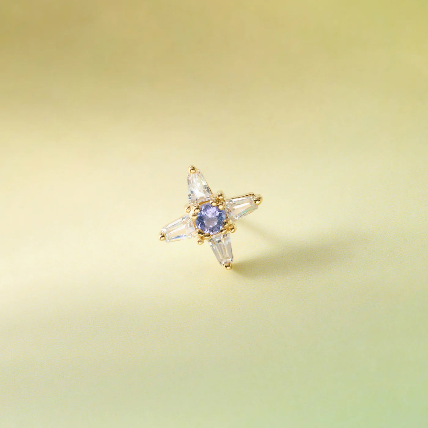 Parallax pairs a Tanzanite center with icy CZ Baguettes, arranged in perfect symmetry. With clean lines and a subtle pop of color, it’s made to turn heads from every angle.