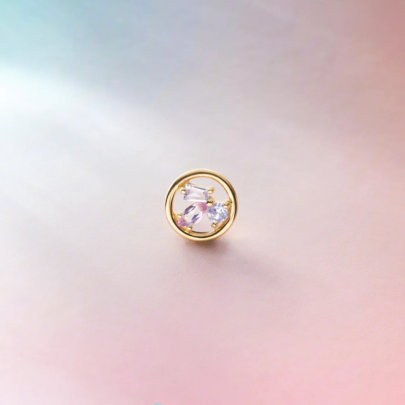 Get lost in the glow of Purple Haze! Framed by a sleek gold circle, this design pairs two Tanzanite stones with an Amethyst for a look that’s soft and subtly spellbinding.