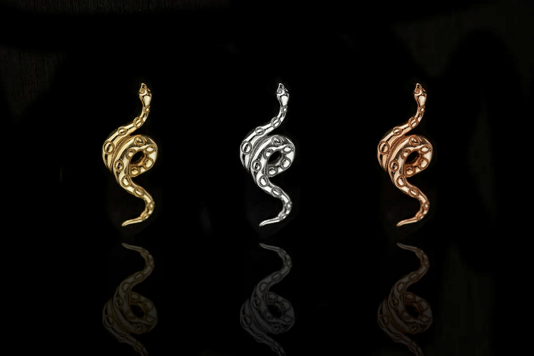Measuring 4mm x 11mm and available in Yellow, Rose and white gold, the Junipurr Textured Snake end pairs well with any APP approved post.