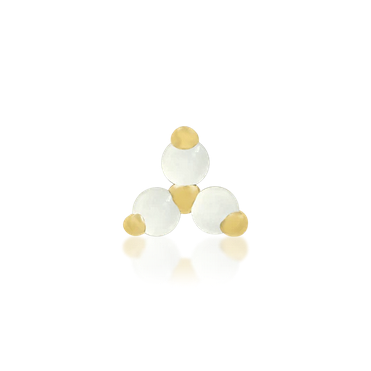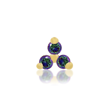 The Trinity with Cubic Zirconia piece features a prong-set cluster of three 1.5mm clear Swarovski gemstones. This classic looking threadless decorative end is available in 14 karat Yellow Gold, White Gold and Rose Gold options. Measuring 4mm x 3.40mm, it can be used in any piercing that is fit with a threadless post from all major jewelry vendors.
