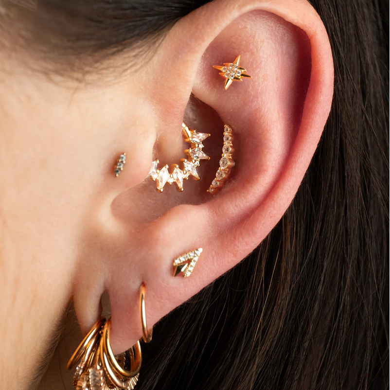Unveil the magic of Wonderland, a clicker that blends bold design with radiant sparkle. Featuring kite-cut CZs, this septum and daith clicker adds a geometric twist to your piercing, offering a bold yet refined look.